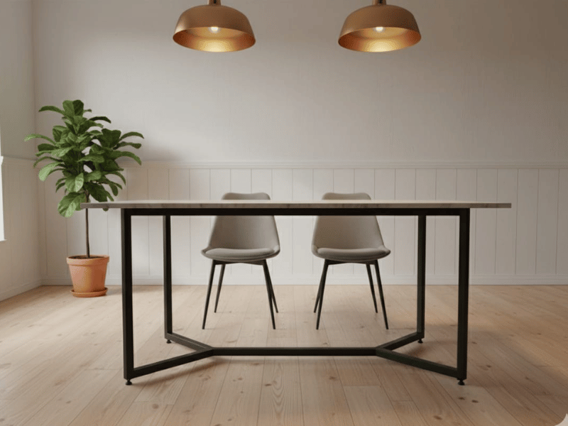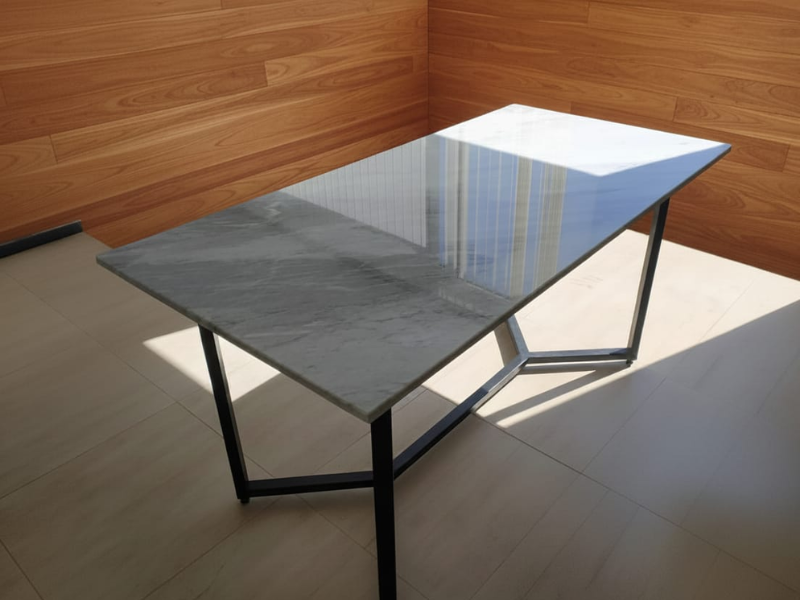 - Mesa de comedor con cubierta de mármol Carrara y base de metal en perfil 40x30mm